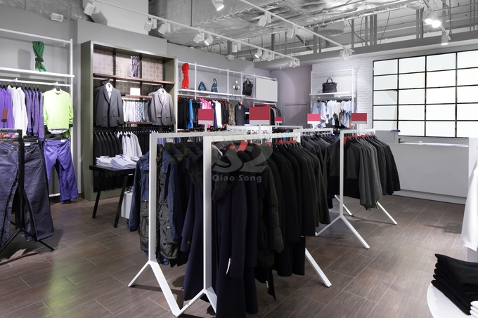 Store designers choose display racks to solve display needs for various items. The brand will place the recommended season items on display tables at different height levels. Brightly illuminated walls and shelving create a calm and generous spatial impression.