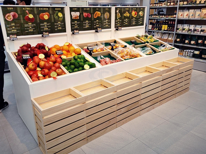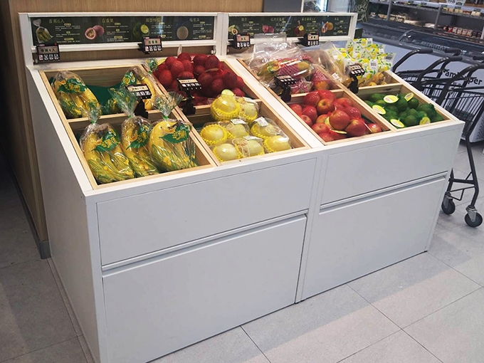 The display stands are designed in white and wood colors, presenting fresh and in-season vegetables and fruits. The solid wood baskets bring consumers ingredients that are natural-oriented.