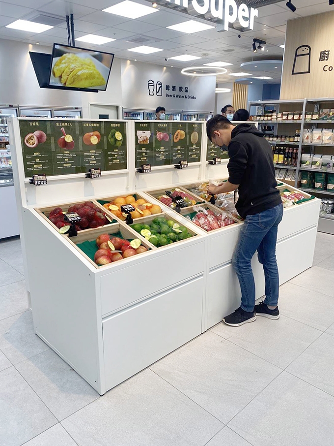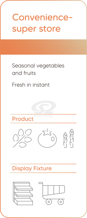 One-third of the display area is a supermarket, displaying 12 categories of frozen meat, frozen ready-to-eat conditioners, fresh vegetables, condiments, fruits, eggs, and dairy products. When you enter the convenience store, a row of new agriculture is put on the baskets to catch your eyes, just like coming to the supermarket in a second.