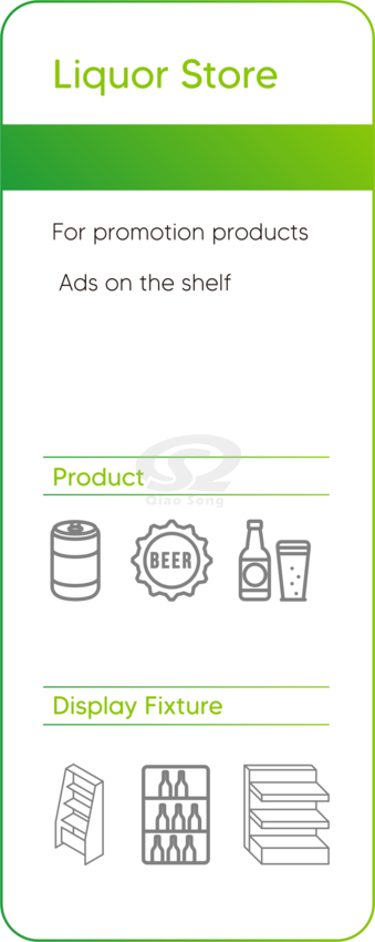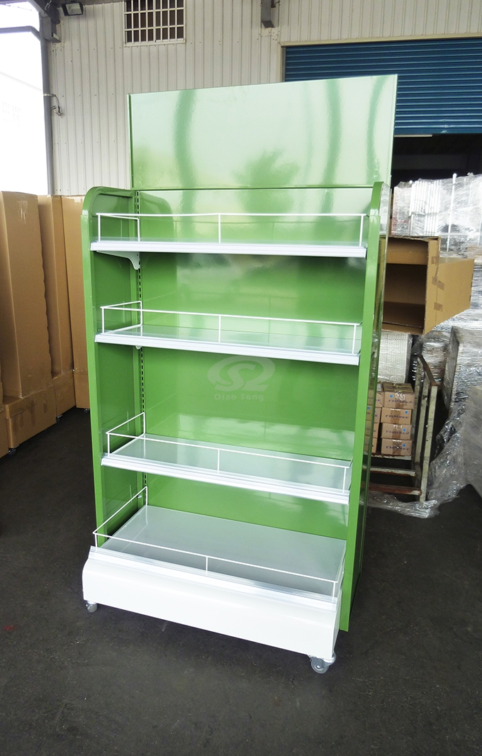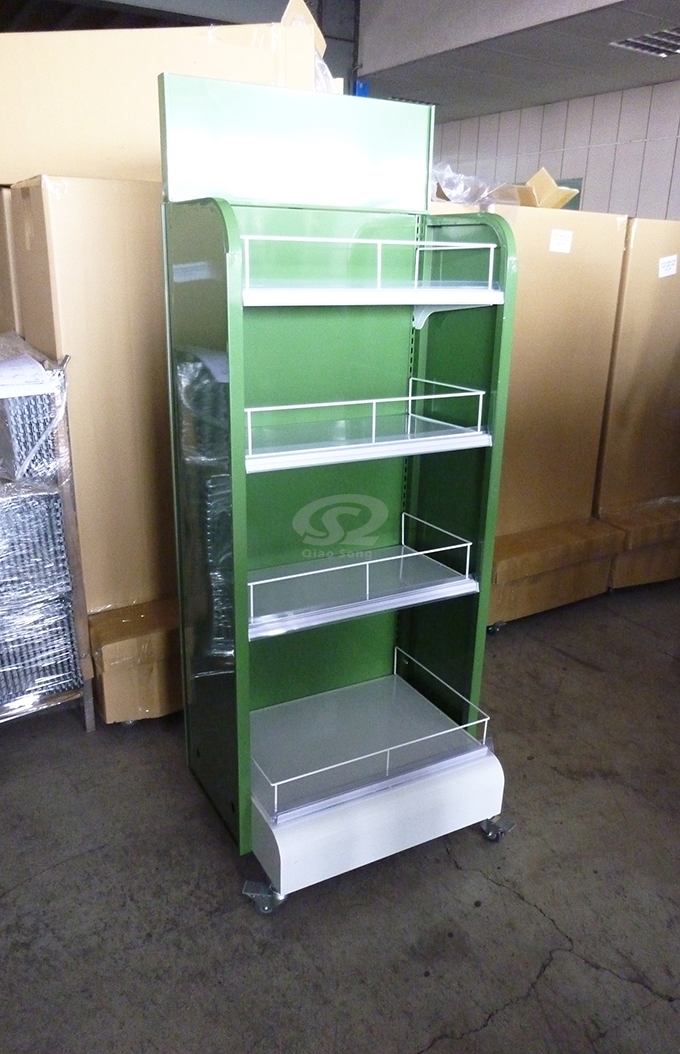Customized shelf with green color gives a fresh look! Ads can be easier to show on the side of the bracket and on the top of a stand to attract customer attention.