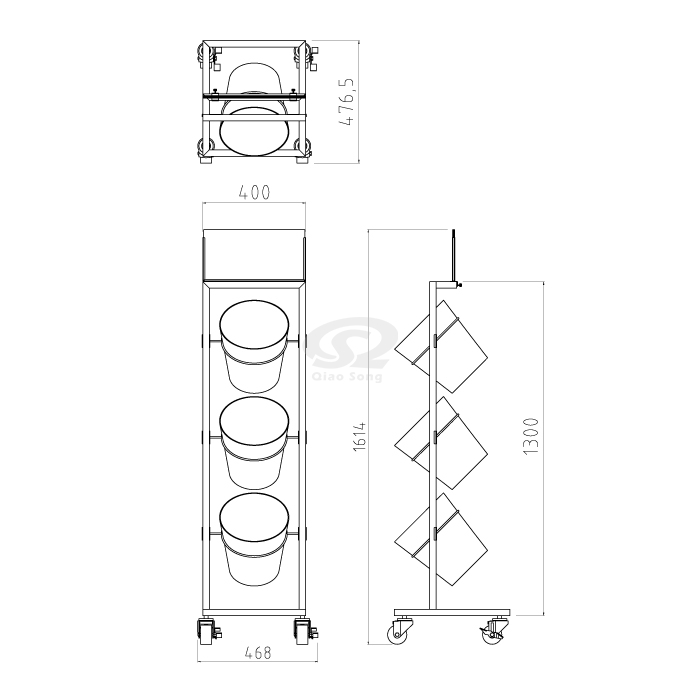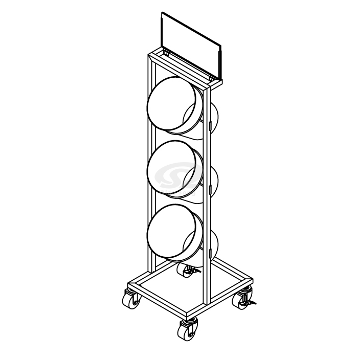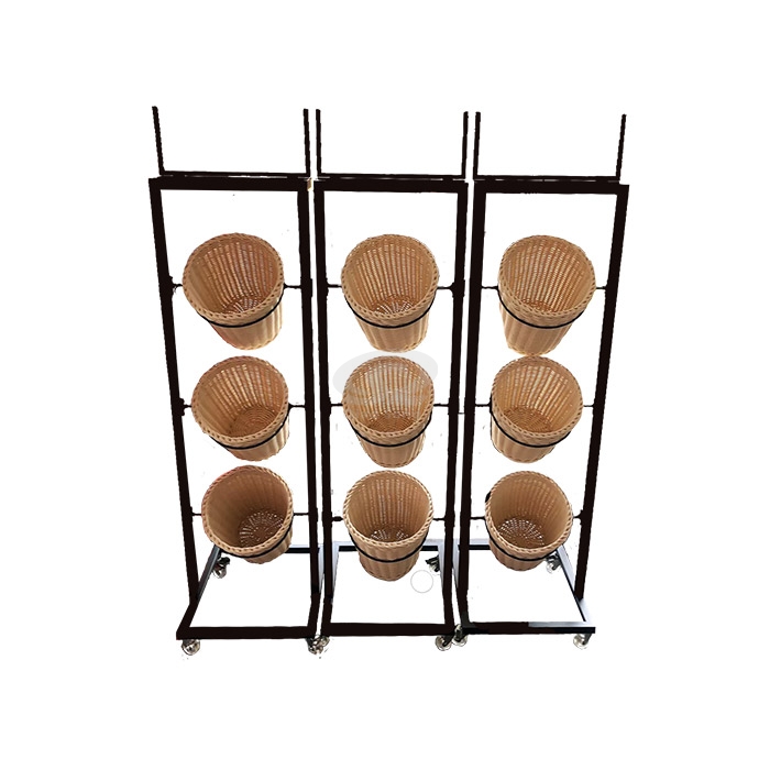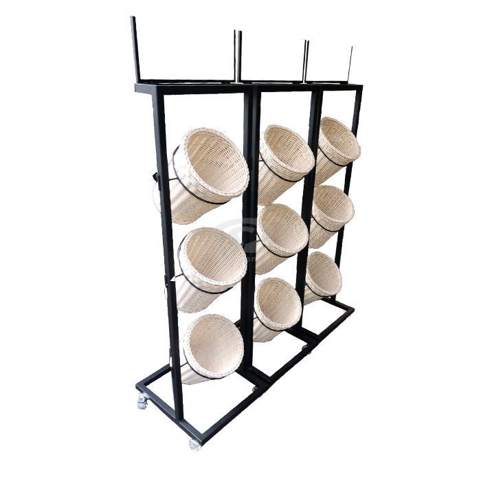 A black sandy powder-coated steel tube with three beige rattan baskets looks good in its material and color. The body frame is a KD design, and three baskets can pile up to save volume when transportation. The store commonly applies the display rack for promotional items; you can put the POP frame on top of the body. With lockable castors constantly adding mobility, you can also detach the POP frame for display.