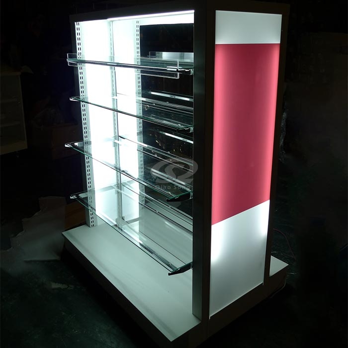 The cosmetics include makeup and skin care products such as creams, liquid, powder, gel, or oil for different uses on the face, body, and hands. The global cosmetics market is a significantly developed industry, sold through various channels, and makes it much easier for many people to obtain knowledge and commodities. Cosmetic shelving can be seen everywhere in department stores, specialty stores, convenience stores, or grocery to display beauty products. In the cosmetic display industry, retail stores apply display props-cosmetic display shelves, racks, cosmetic display cases, and makeup stands to show customers the best products. Oiao Song's cosmetic display stand is a floor-standing and independent shop shelving; the top layer is a large glass panel that can display larger bottles of skin care or cosmetic products. The stand has a total of five layers of glass shelves to increase the display number, and the transparent shelves show accessibility; the side is equipped with LED lights, which not only increase lighting but also give beauty products warmly.