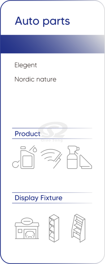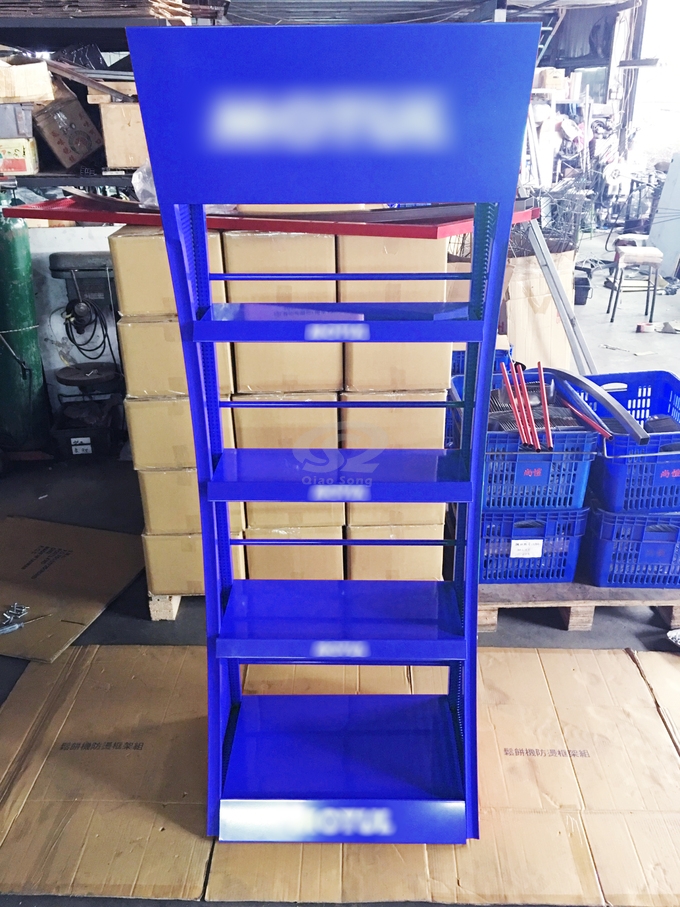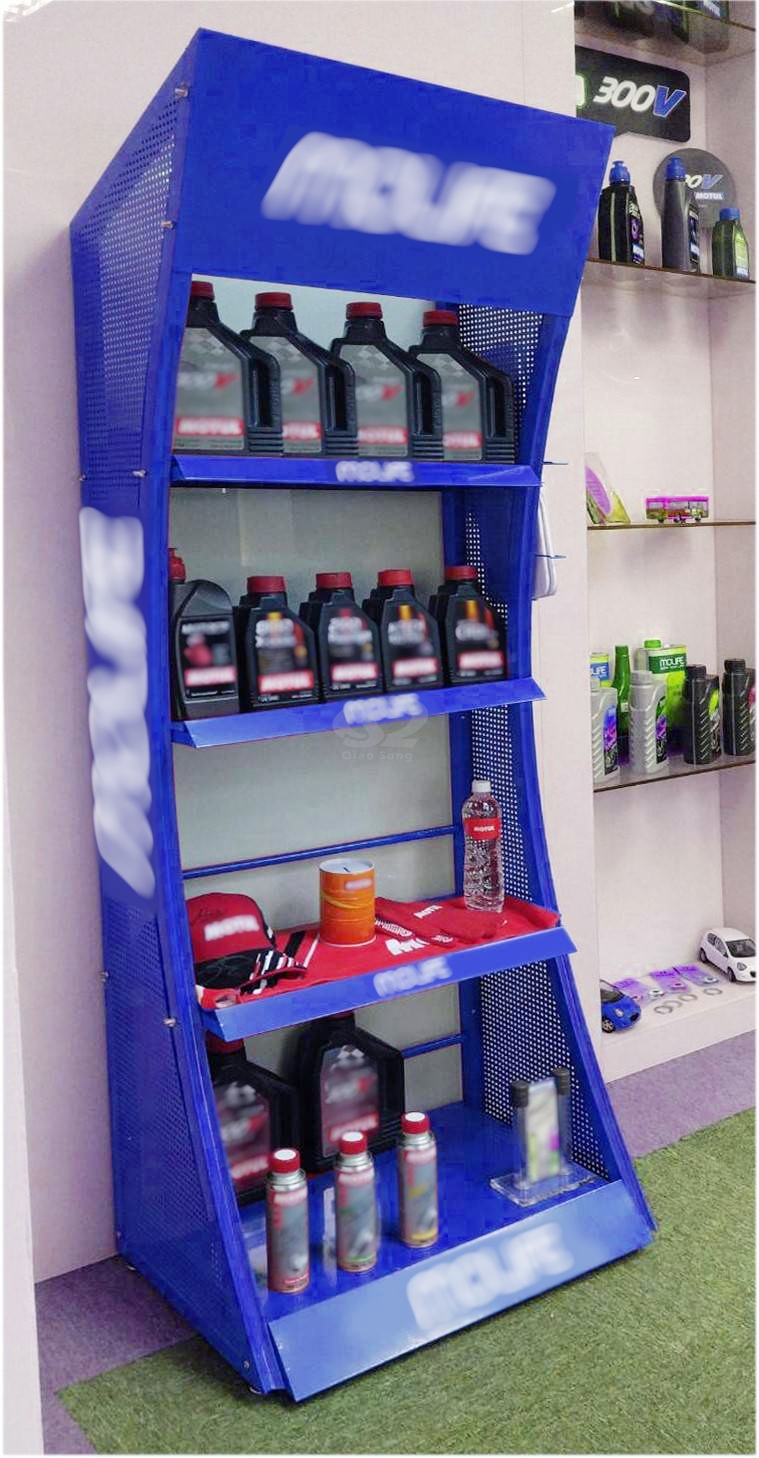 4層のメタルディスプレイラック。フレームの曲線的なフォルムがスタイリッシュな印象を与えます。青色を基調としたカスタマイズされた棚がお客様の目を引きます。ブランドを宣伝するために、フレームの上部と側面に広告が表示されやすくなります。